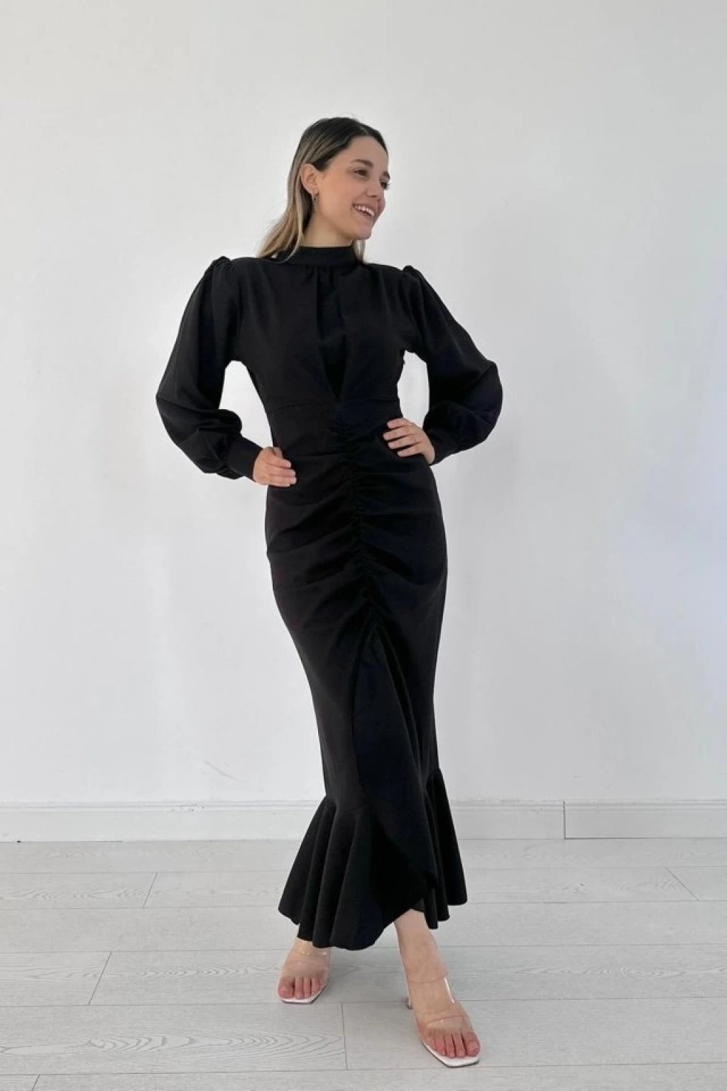 Siyah Volanlı Uzun Kol Elbise