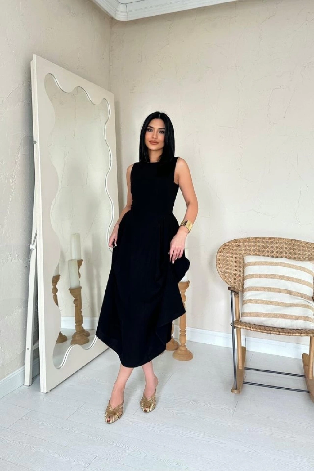 Siyah Yanları Büzgülü Midi Boy Keten Elbise