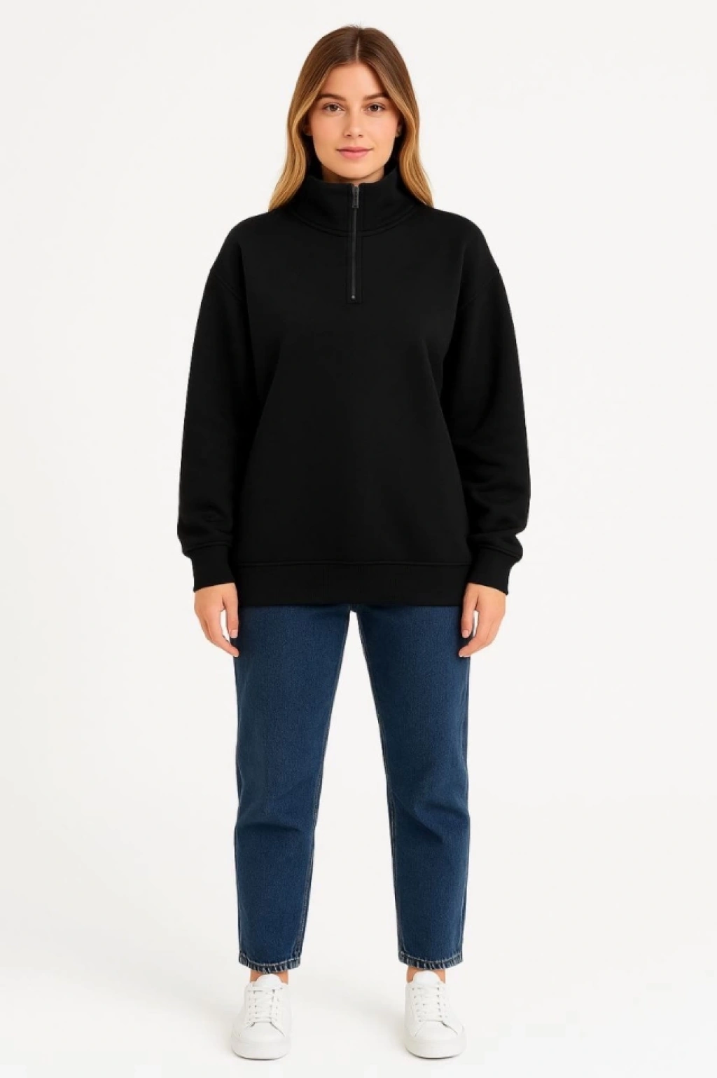 Üç İplik Dık Yaka Yarım Fermuarlı SweatShirt - Siyah