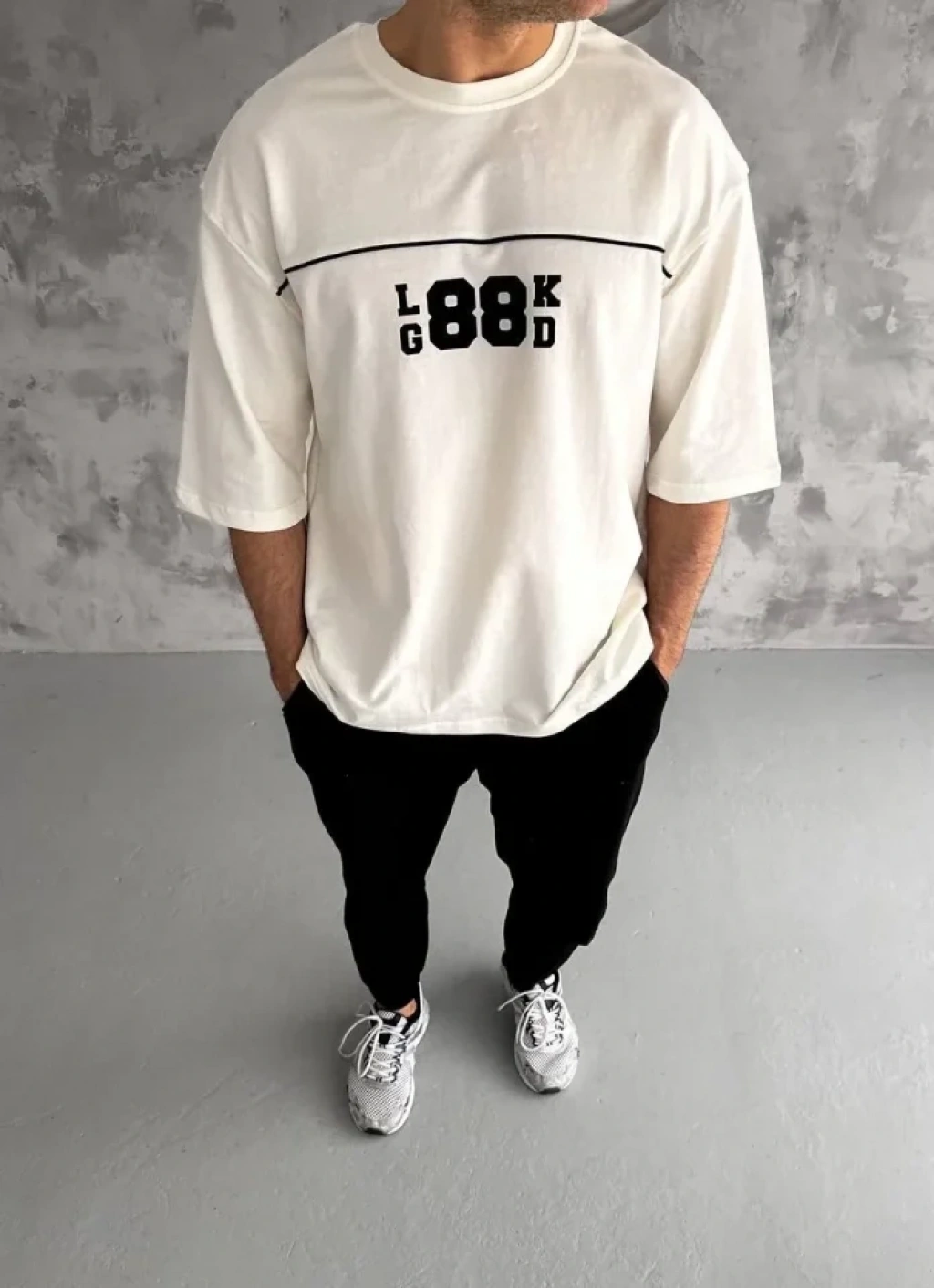 Unisex Bisiklet Yaka Baskılı Oversize T-Shirt - Beyaz
