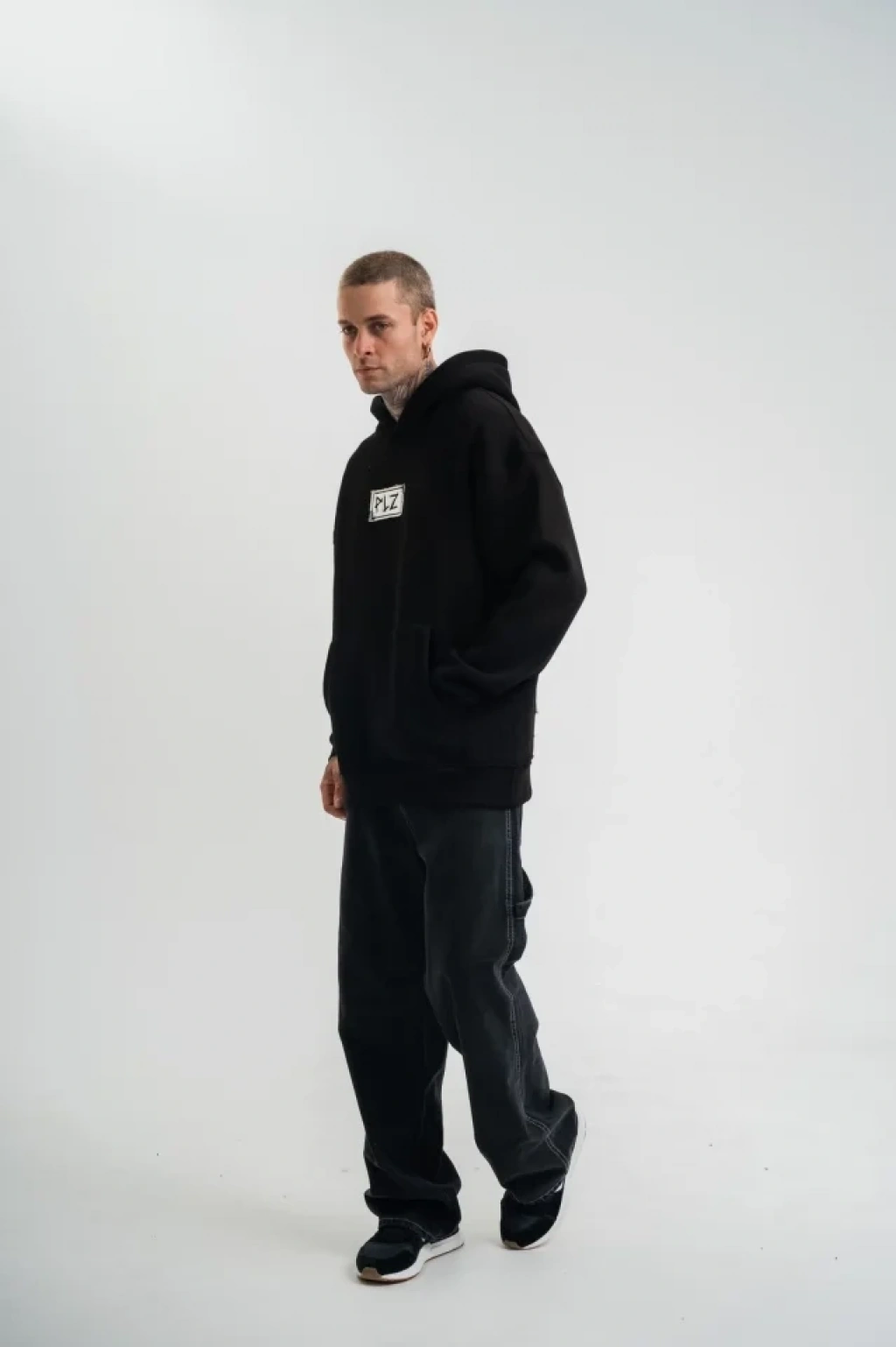 Erkek Premium Nakışlı Kapşonlu Sweatshirt Double Oversize Üç İplik Pamuklu - Siyah