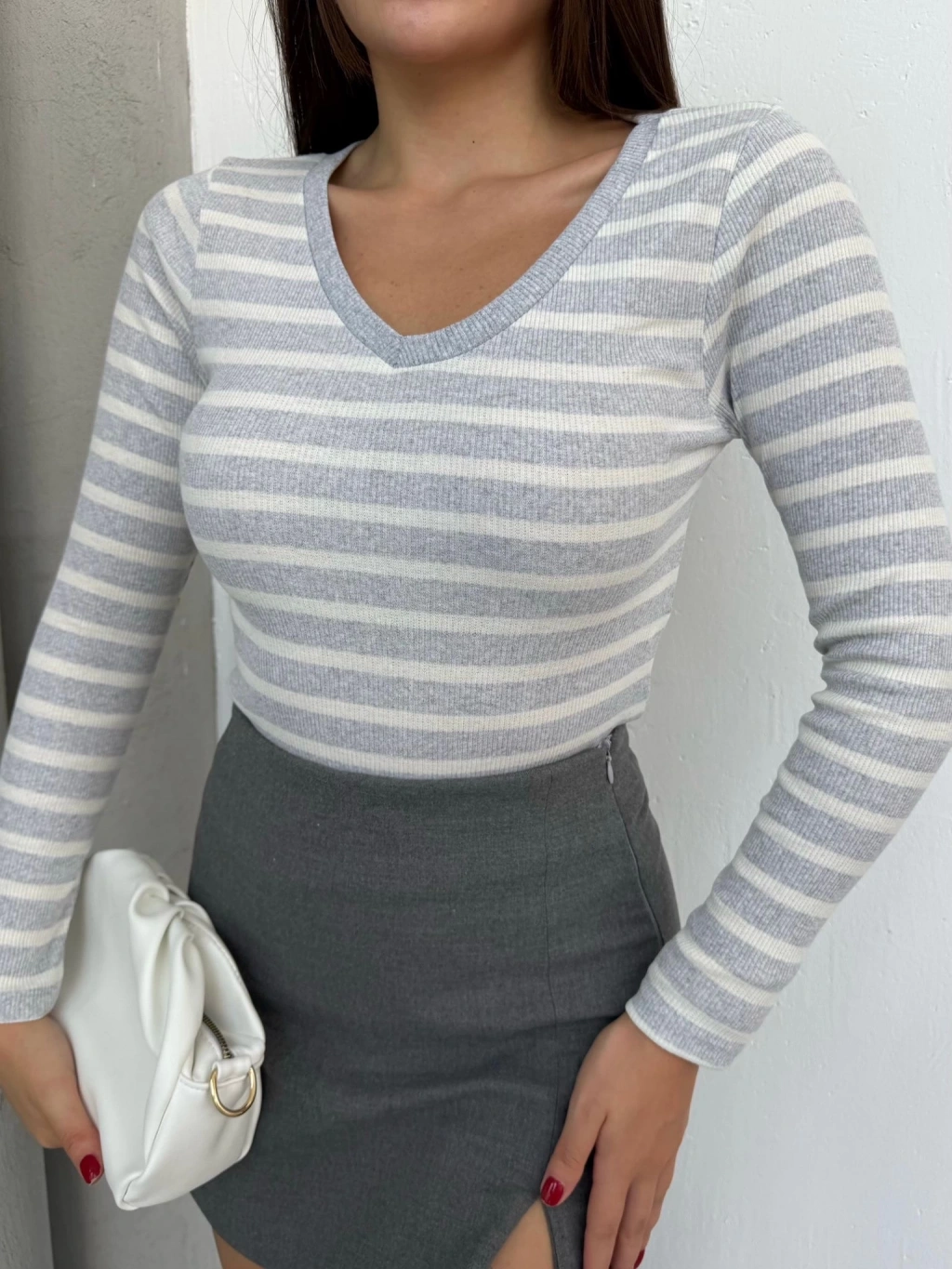 Bu sezonun trendlerine uygun V yaka çizgili bluz gri A3699, şıklığı ve rahatlığı bir arada sunuyor.
