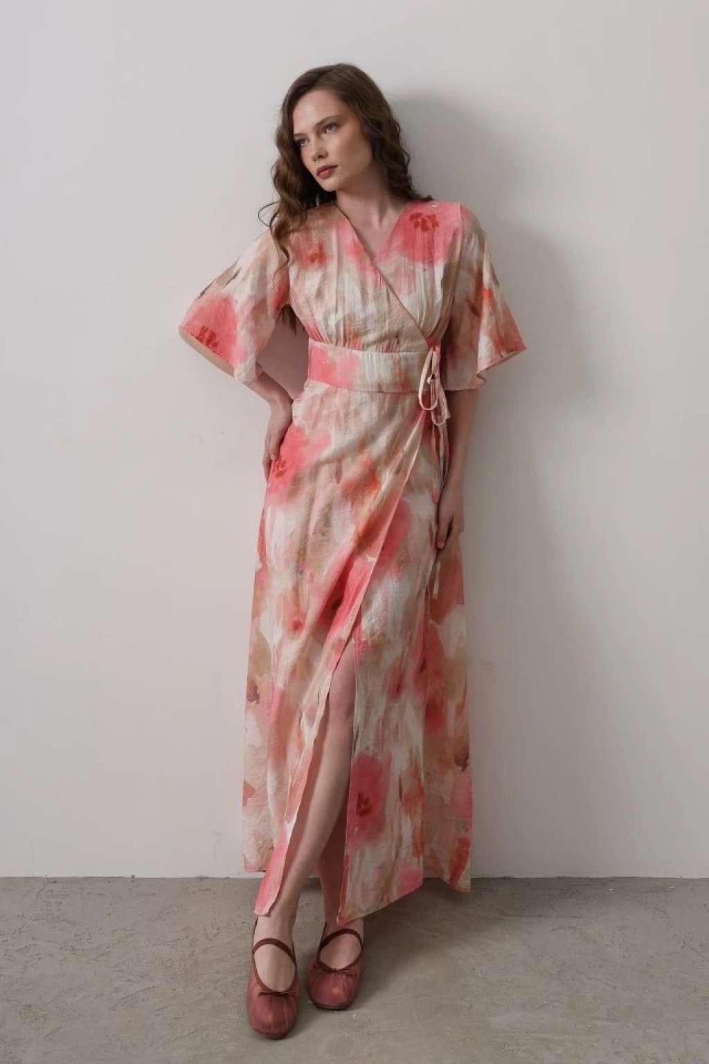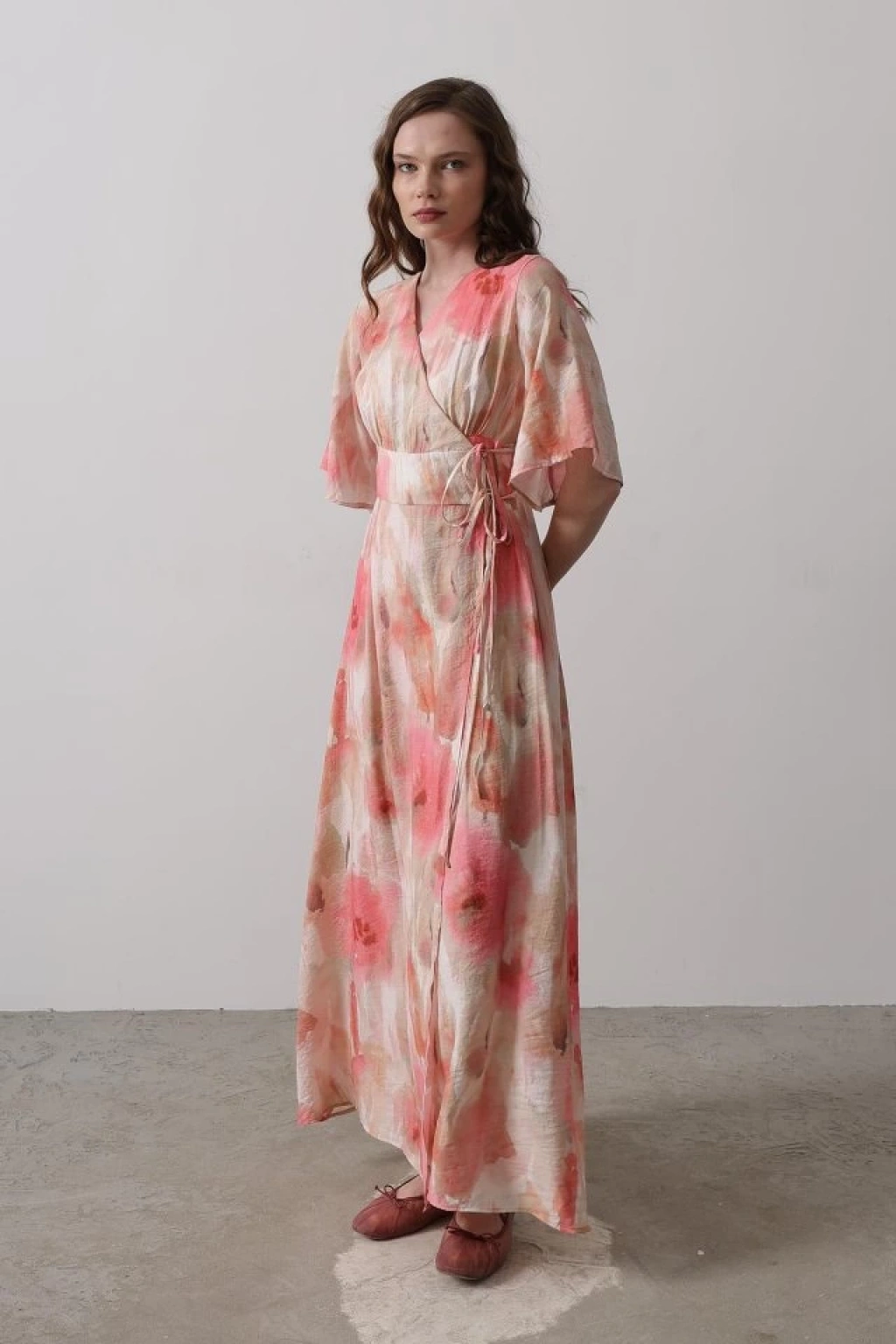 Yandan Bağlamalı Desenli Elbise - Pembe