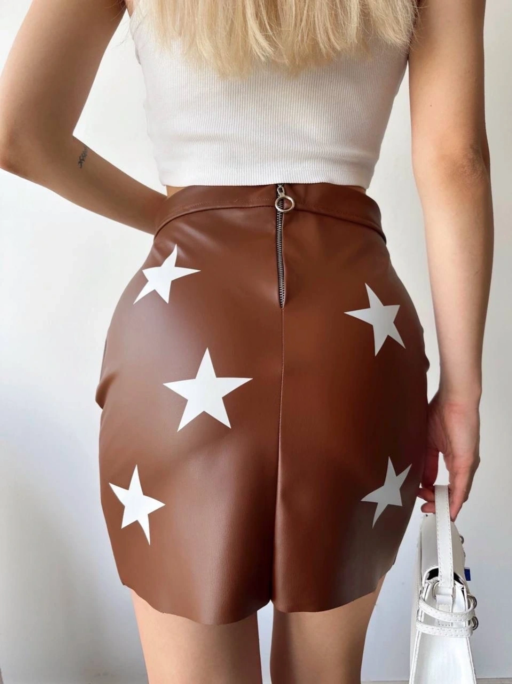 Bu şık ve trend yıldız baskılı deri etek, gardırobunuza yıldızı bir parça ekleyecek! Modern ve şık tasarımıyla her kombini mükemmel bir şekilde tamamlayacak.