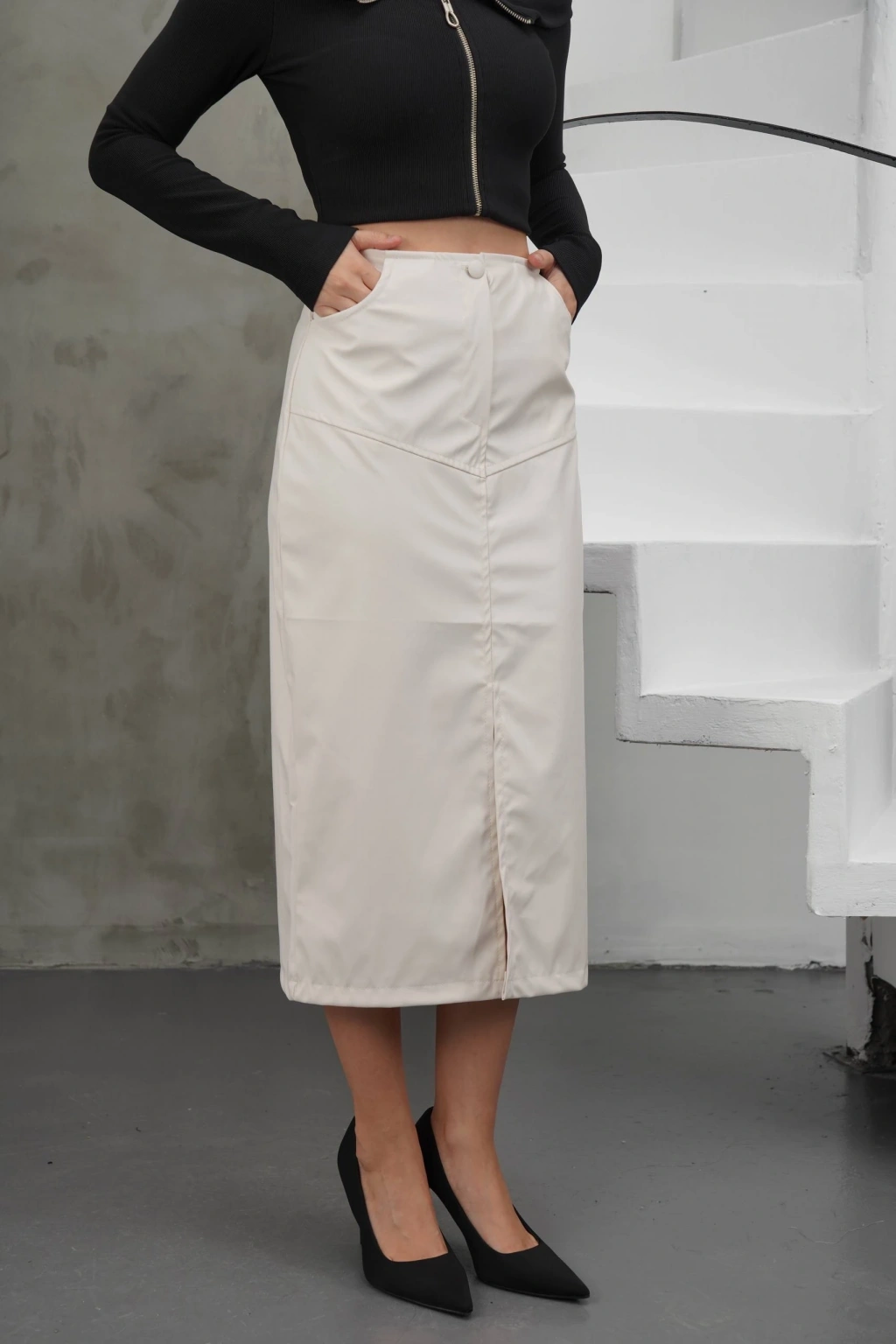 Yırtmaçlı uzun deri etek krem rengiyle gardırobunuza şıklık katacak bir parçadır.