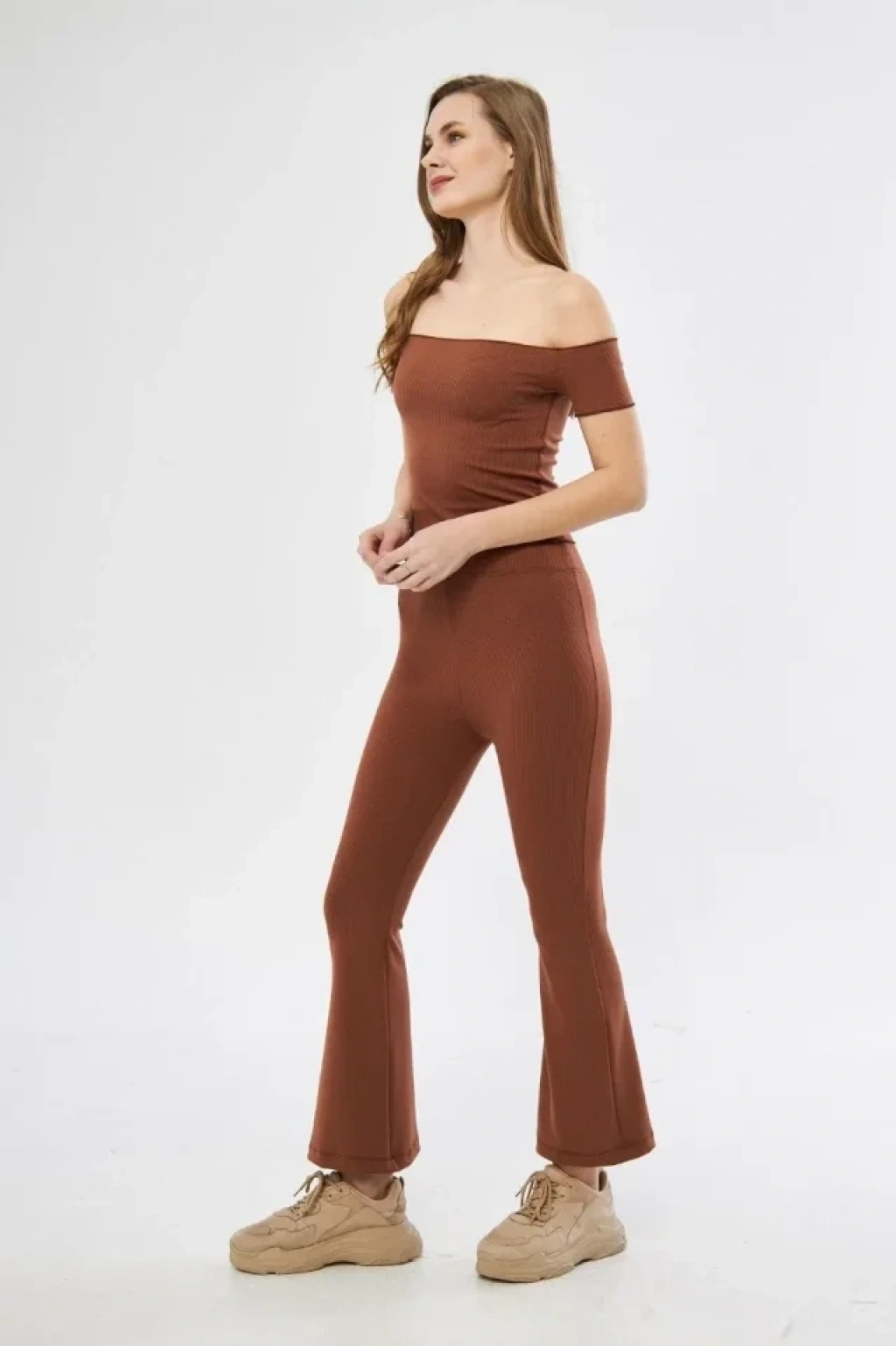 Yüksel Bel Fitilli İspanyol Paça Tayt - Kahve