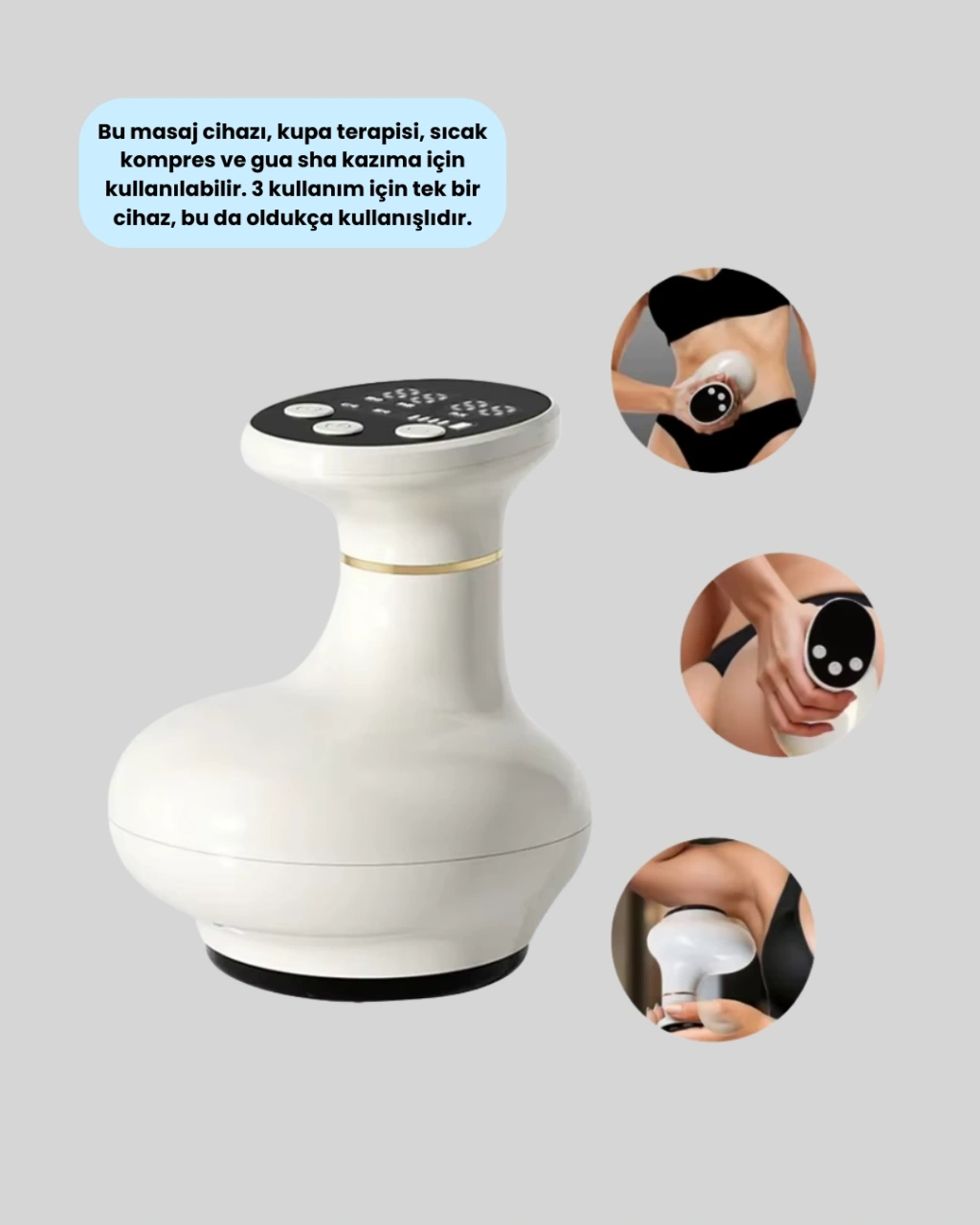 3 Fonksiyonlu Şarjlı Masaj Cihazı, günlük yaşamın stresini azaltmak ve cilt bakımını desteklemek için tasarlanmıştır. Kupa terapisi, sıcak kompres ve gua sha masajını bir arada sunarak çok yönlü bir kullanım sağlar. Tek bir cihazla farklı masaj tekniklerini uygulayabilme imkânı sunması, ürünü oldukça kullanışlı hale getirir.USB ile şarj edilebilir olması, cihazı kablosuz ve pratik kılar. Hafif ve kompakt tasarımı sayesinde kolayca taşınabilir ve her ortamda kullanılabilir. Masaj salonlarına gitmeye gerek kalmadan evde profesyonel masaj deneyimi yaşamak isteyenler için ideal bir çözümdür.Kupa terapisi özelliği, vakum etkisiyle kasların gevşemesine yardımcı olurken sıcak kompres fonksiyonu masajın etkisini artırır. Gua sha kazıma modu ise cilt yüzeyini uyararak daha sağlıklı ve pürüzsüz bir cilt görünümünü destekler. Düzenli kullanımda cilt elastikiyetinin artmasına katkı sağlar.Baldır, uyluk, kalça, karın, kol ve sırt gibi farklı bölgelerde kullanılabilir olması, ürünü çok yönlü bir bakım cihazı haline getirir. Hem rahatlama hem de cilt bakımı amaçlı kullanılabilen bu masaj cihazı, fonksiyonel yapısı ve şık tasarımıyla sevdikleriniz için de anlamlı bir hediye seçeneği sunar.